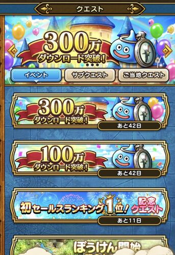 んげです。ドラクエウォークに絶賛ハマり中。 ダウンロード数がすごいみたい なんか100万DL突破イベントと300万DL突破イベントが同時に開催された。 一つで福引券50枚もらえて両方クリアでスペシャル装備福引10連ができる! と思って遊んだら…