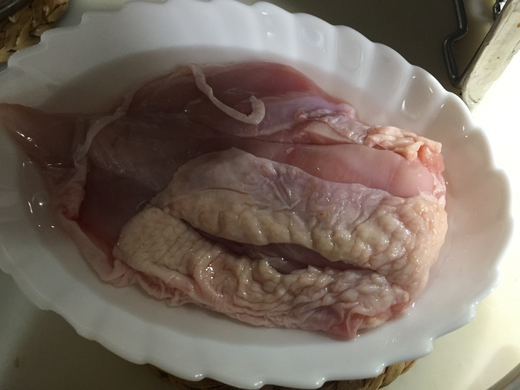鶏むね肉をお酒につけておきます。調理酒に15ページ分くらい。