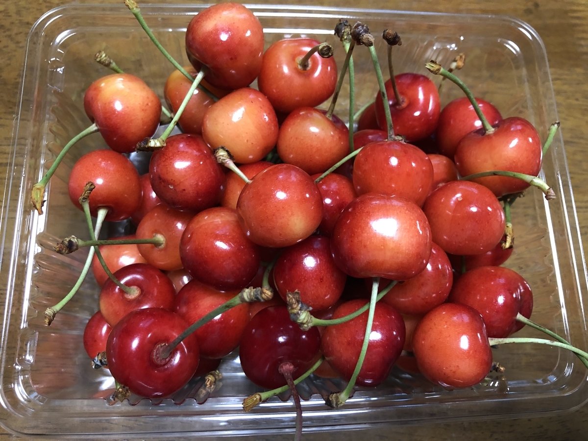 山形に住んでいると、出荷できないさくらんぼをいただくことは常なんですが、今回のこれは贈り物としてもらったものをおすそ分けいただいたもの。