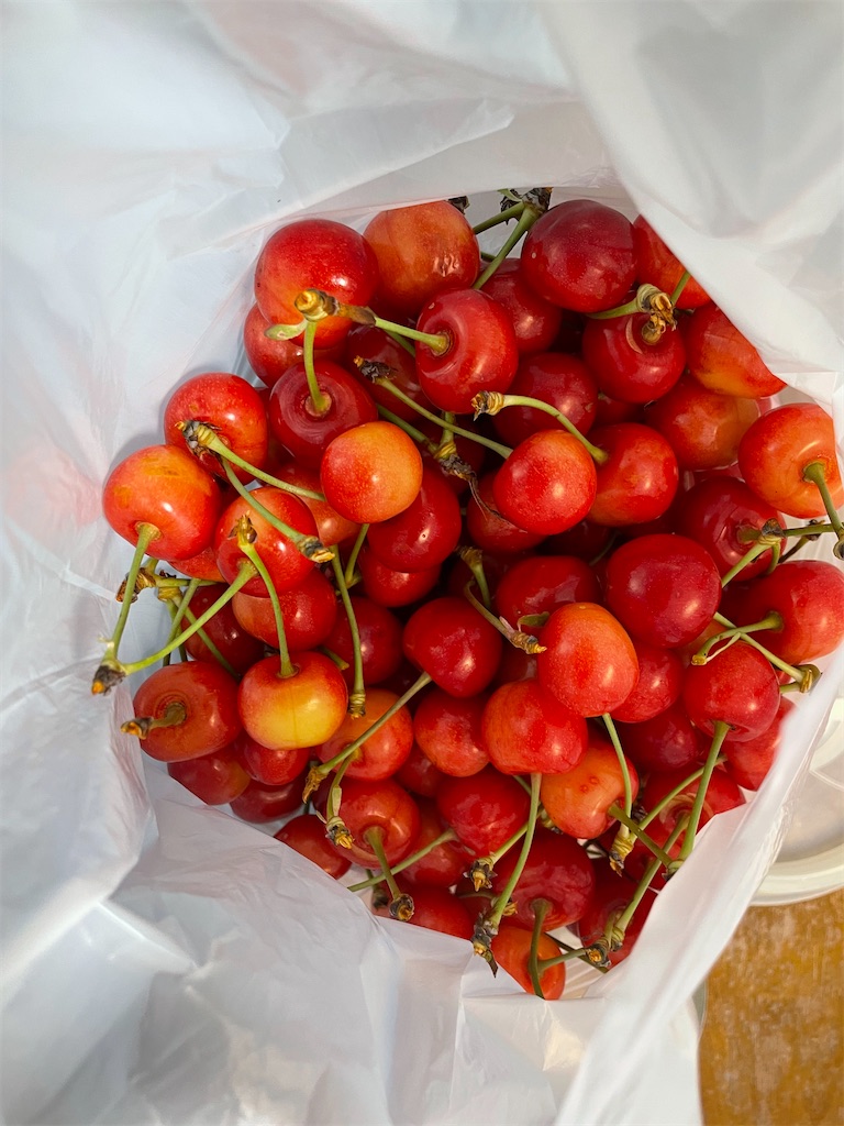 農家さんの数は減っているようだが、実っても傷んだり、キズがあったり、形が悪かったりで規格外の出荷できない実は、かなり出るようで生産者→親族・知人→その知人・友人と配られ、サクランボ生産者に縁がない私たちでも結構いただけるのだ。