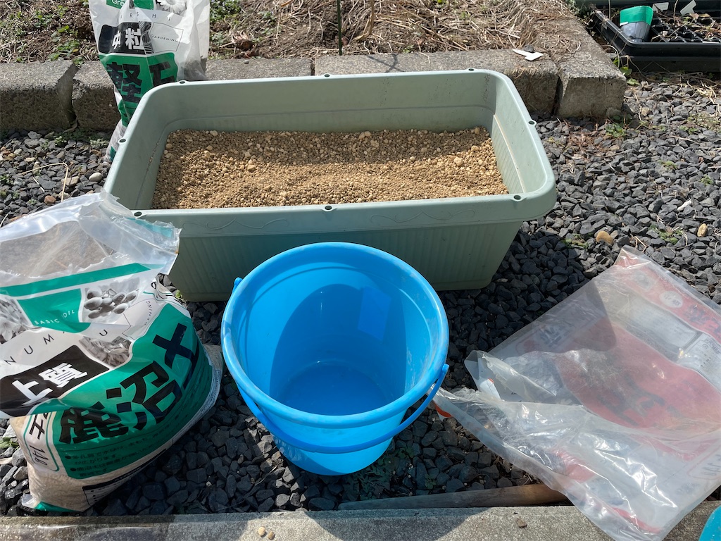 ホームセンターで土買ってきて、ネットで調べた通り混ぜて準備完了。